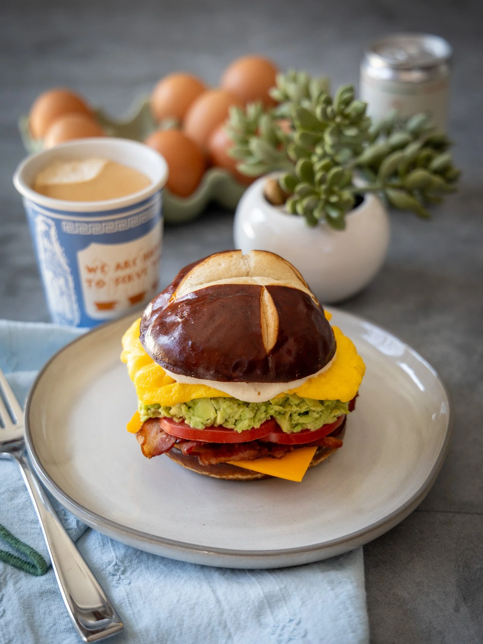 Assemble: Spread 1 Tbsp mayonnaise or aioli on one side of the toasted bun. Layer on the cheese, bacon, sliced tomato, mashed avocado, and the egg patty.
