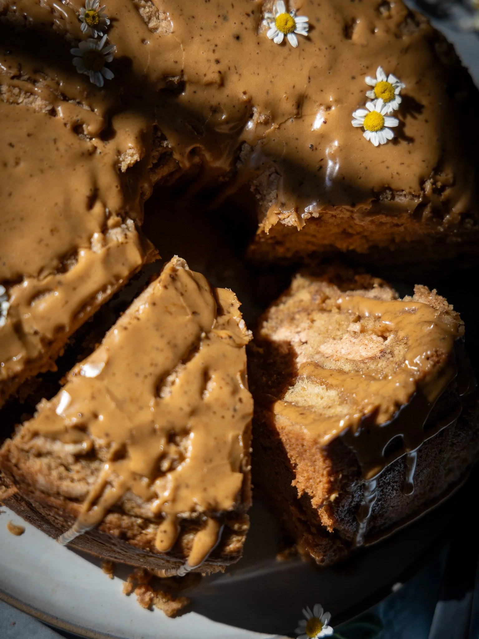To make the glaze, whisk together 1 1/4 cups powdered sugar, 2–3 tablespoons whole milk, 1/2 teaspoon vanilla extract, and 1–3 teaspoons instant coffee (to taste). Add a pinch of flaky sea salt. Drizzle the glaze evenly over the cake and let set for 10 minutes. Serve the cake slightly warm or at room temperature. Keep the cake stored, covered, in the refrigerator.